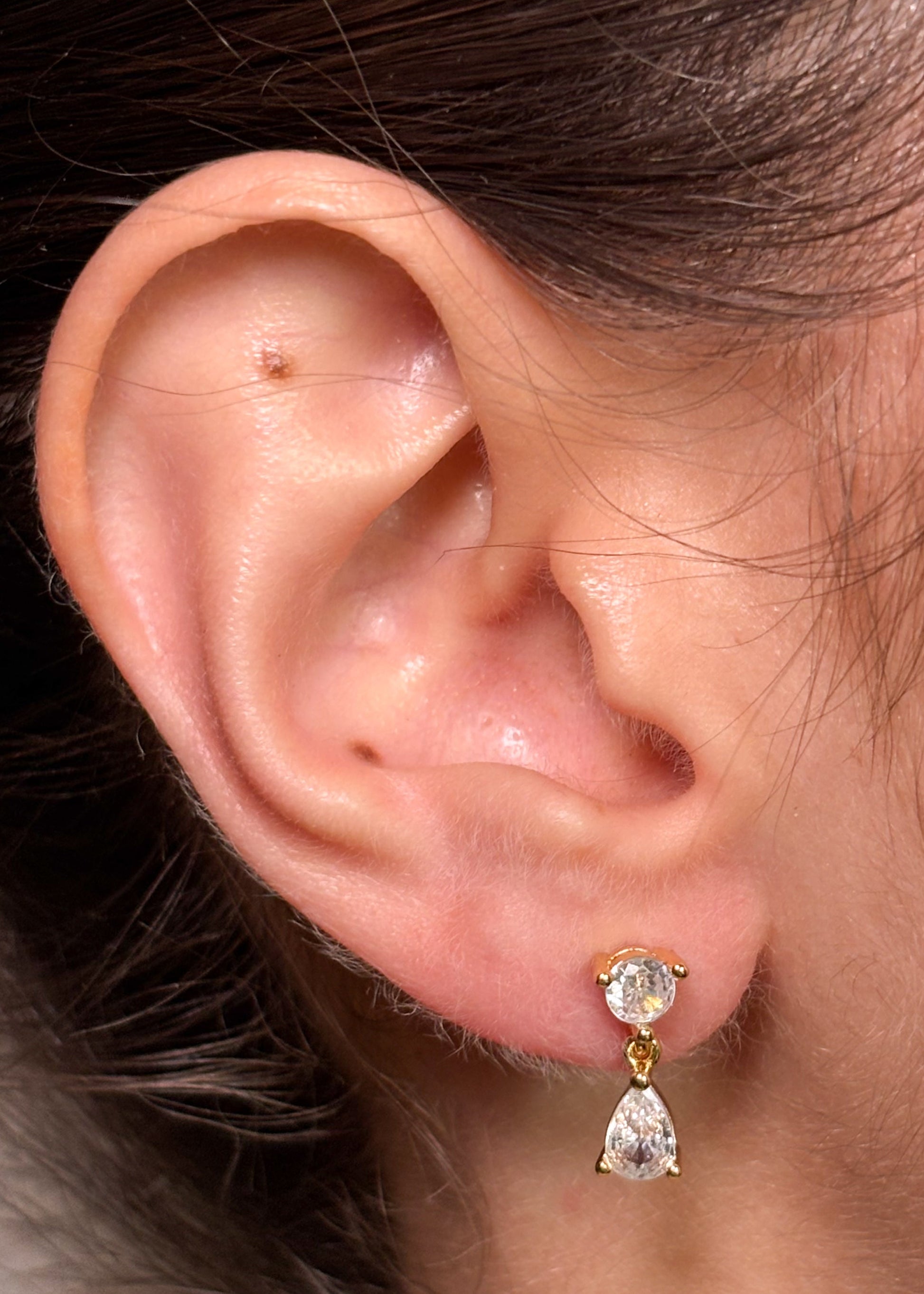 Par de aretes en plata ley 925 chapados en oro de 18K con circones transparentes.