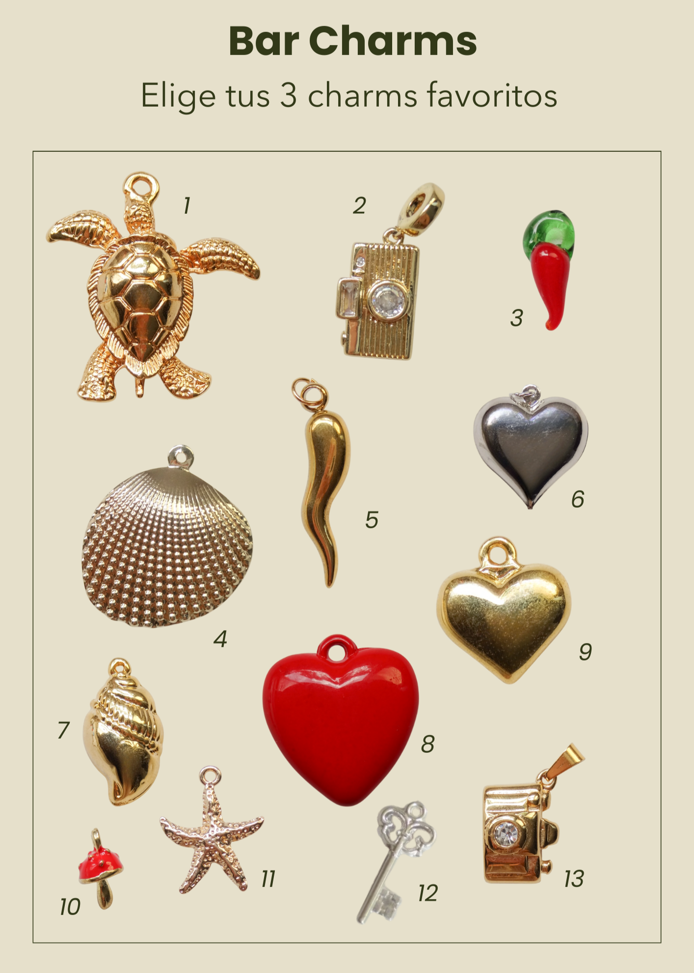 Incluye la cadena tejida a mano con mostacillas + hasta 3 dijes personalizables.