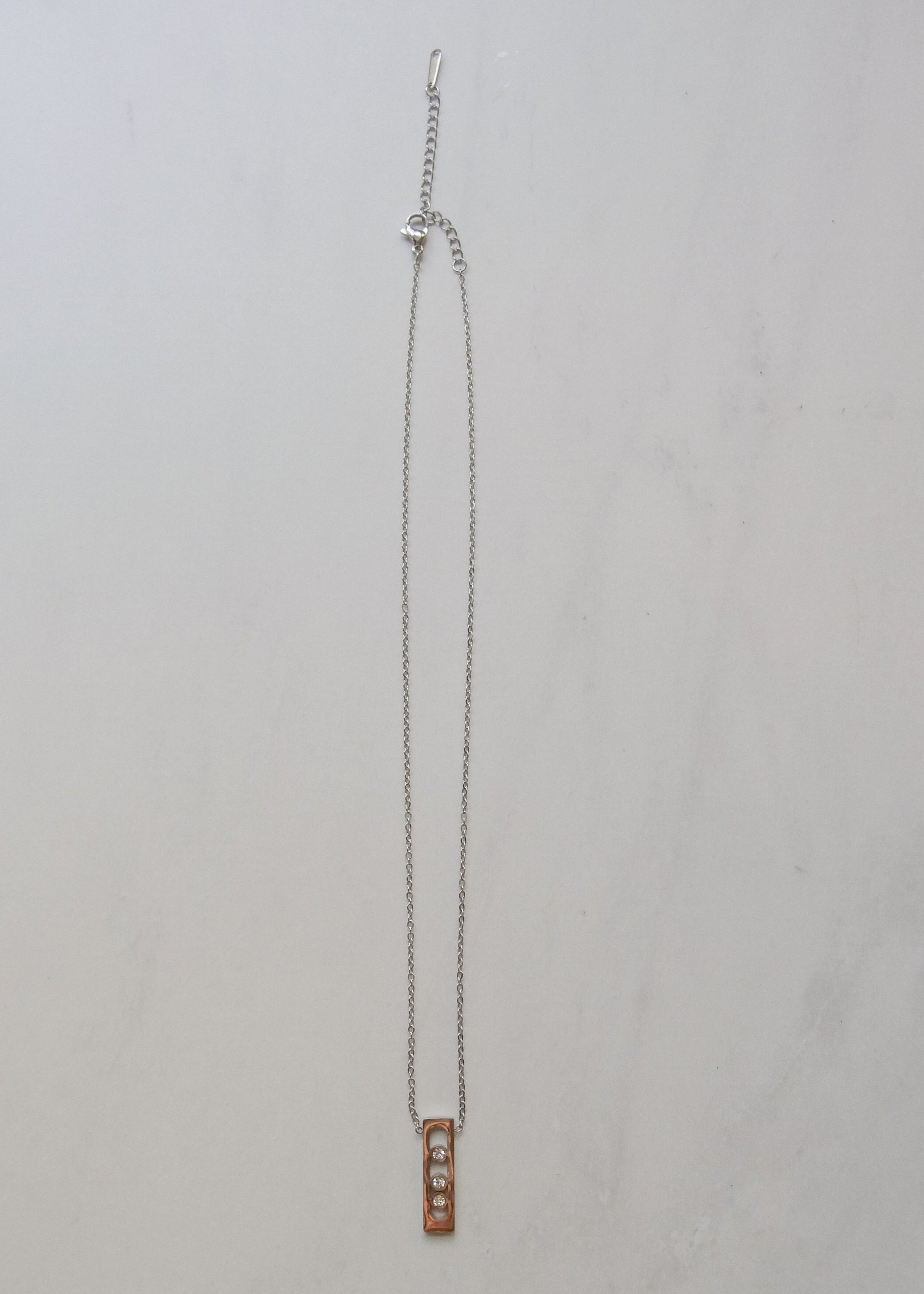 Cadena de acero plateado con dije de tres circones blancos tipo diamante, que aportan brillo y elegancia. Un accesorio versátil y delicado, ideal para usar solo o combinar con otras piezas.