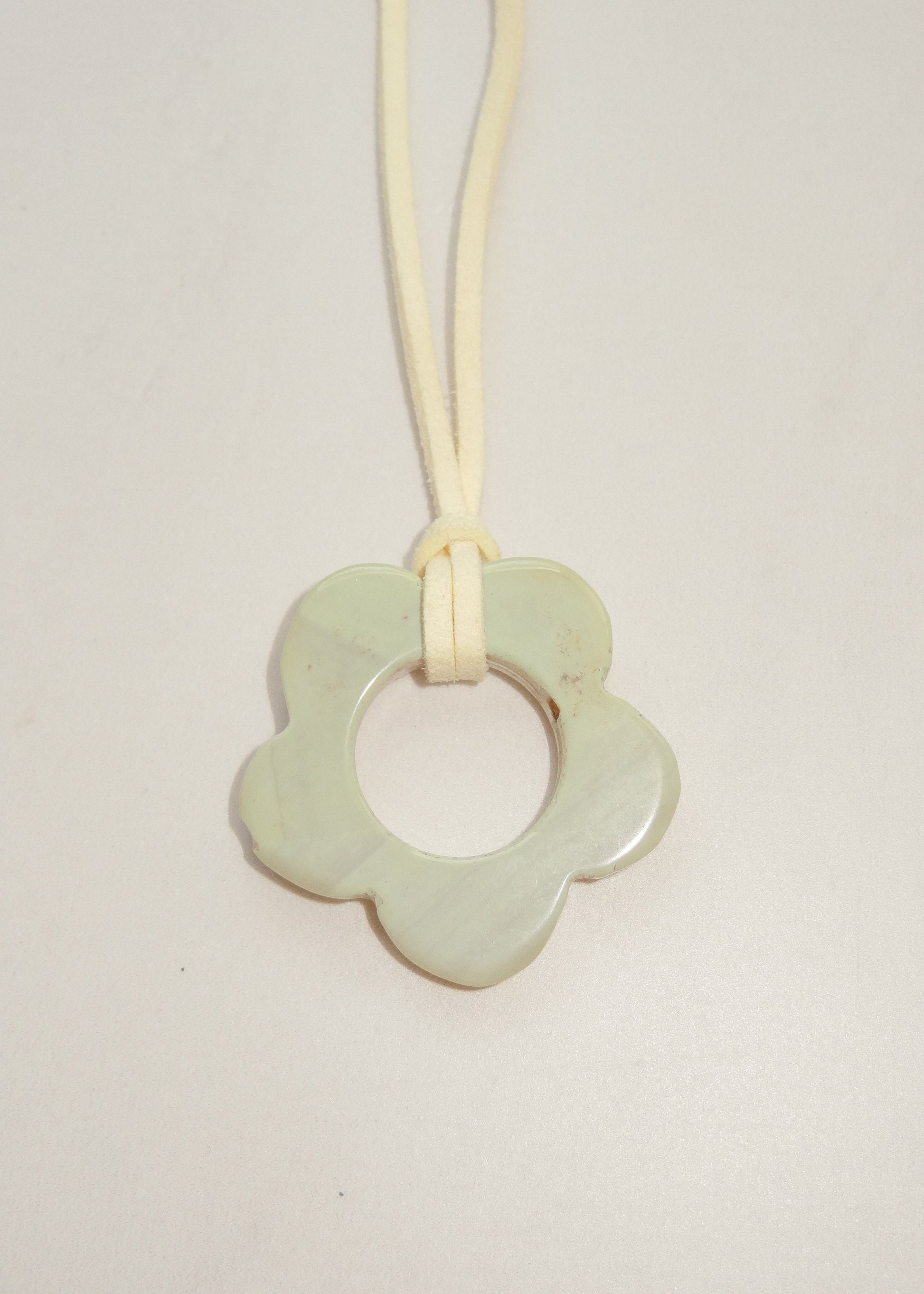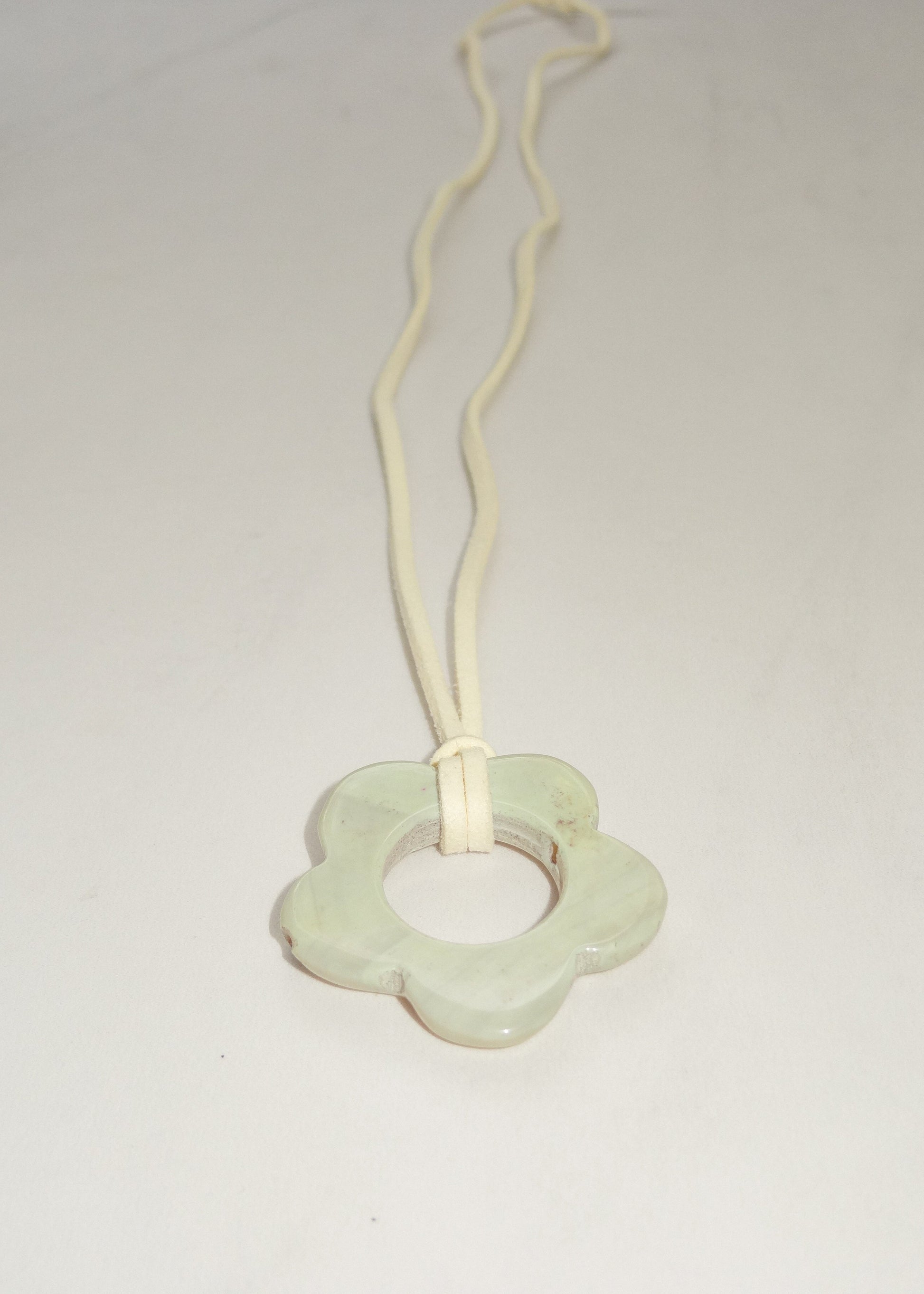Collar tipo boho con cuerdas de cuerina y dije en forma de flor tallada en piedra blanca. Un accesorio artesanal y versátil que combina frescura y estilo relajado.
