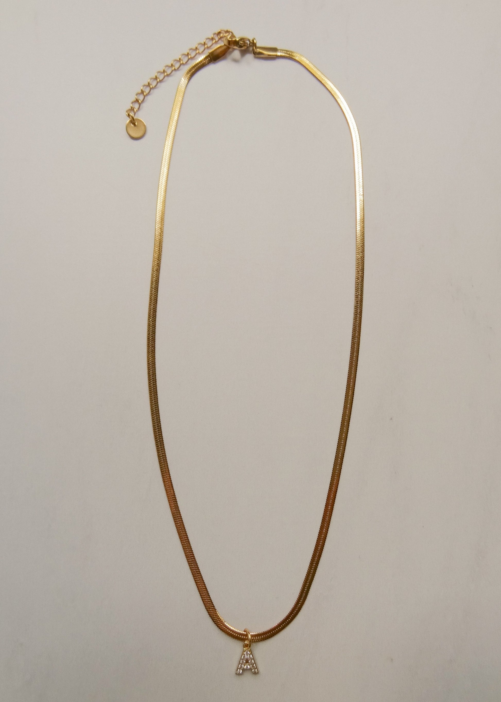 Cadena de acero chapado en oro de 18k con dije de letra A en circones brillantes. Un accesorio personalizado y elegante, perfecto para llevar tu inicial siempre contigo.