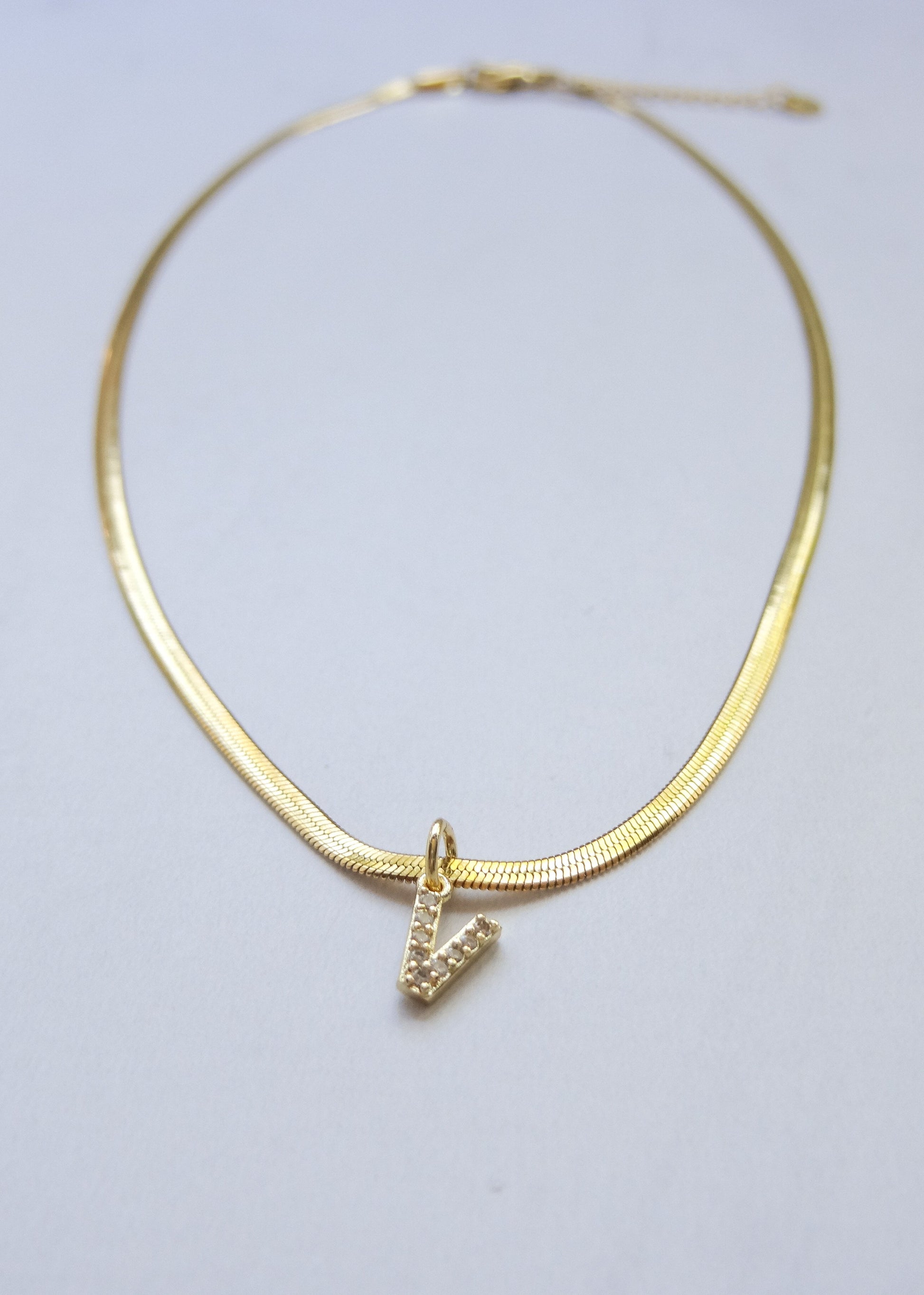 Cadena de acero chapado en oro de 18k con dije de letra V en circones brillantes. Un accesorio personalizado y elegante, perfecto para llevar tu inicial siempre contigo.