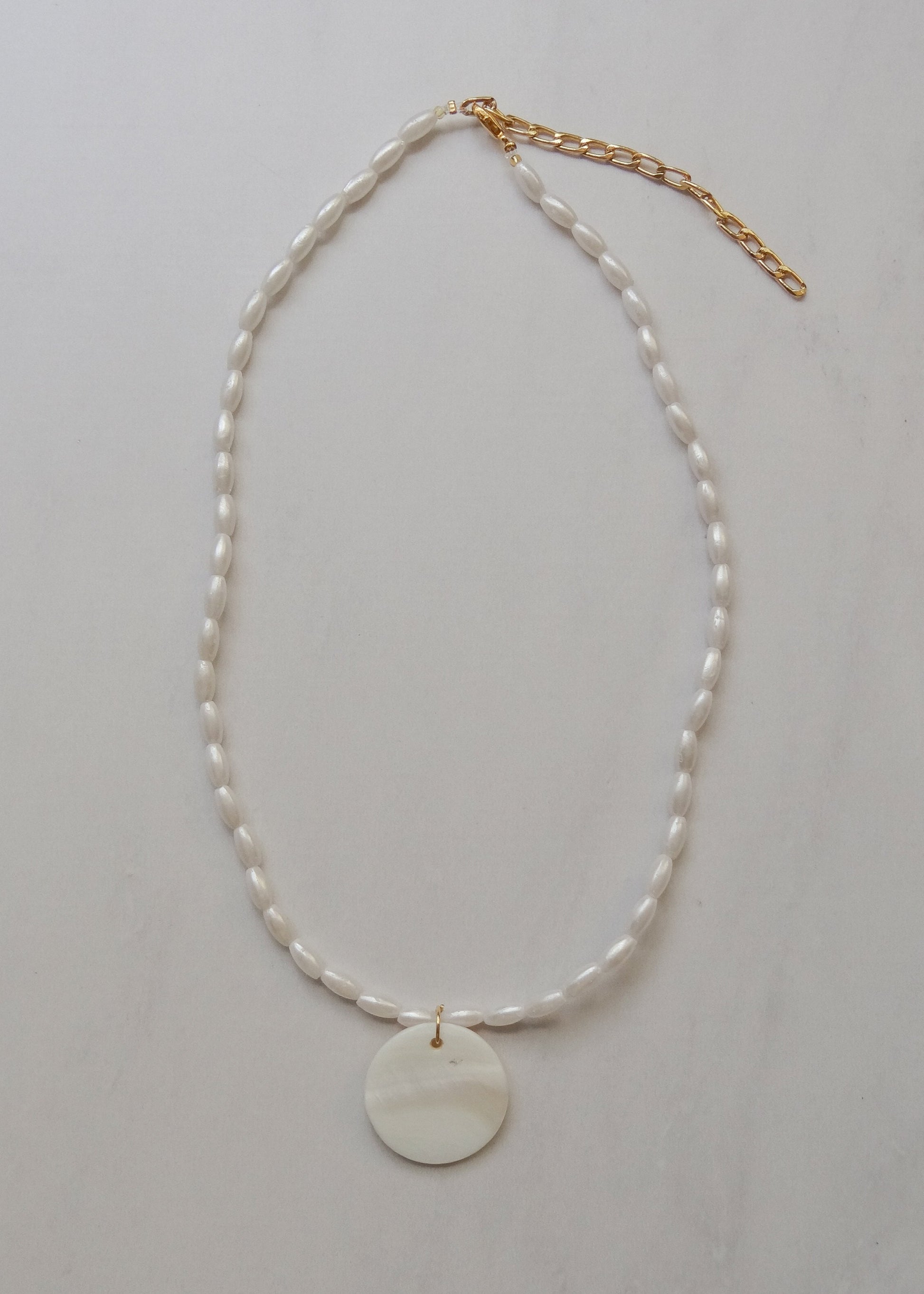 Collar con perlas alargadas de plástico y dije redondo en nácar, ligero y elegante. Perfecto para días de playa, aportando un toque fresco y sofisticado que complementa a la perfección tus looks veraniegos.