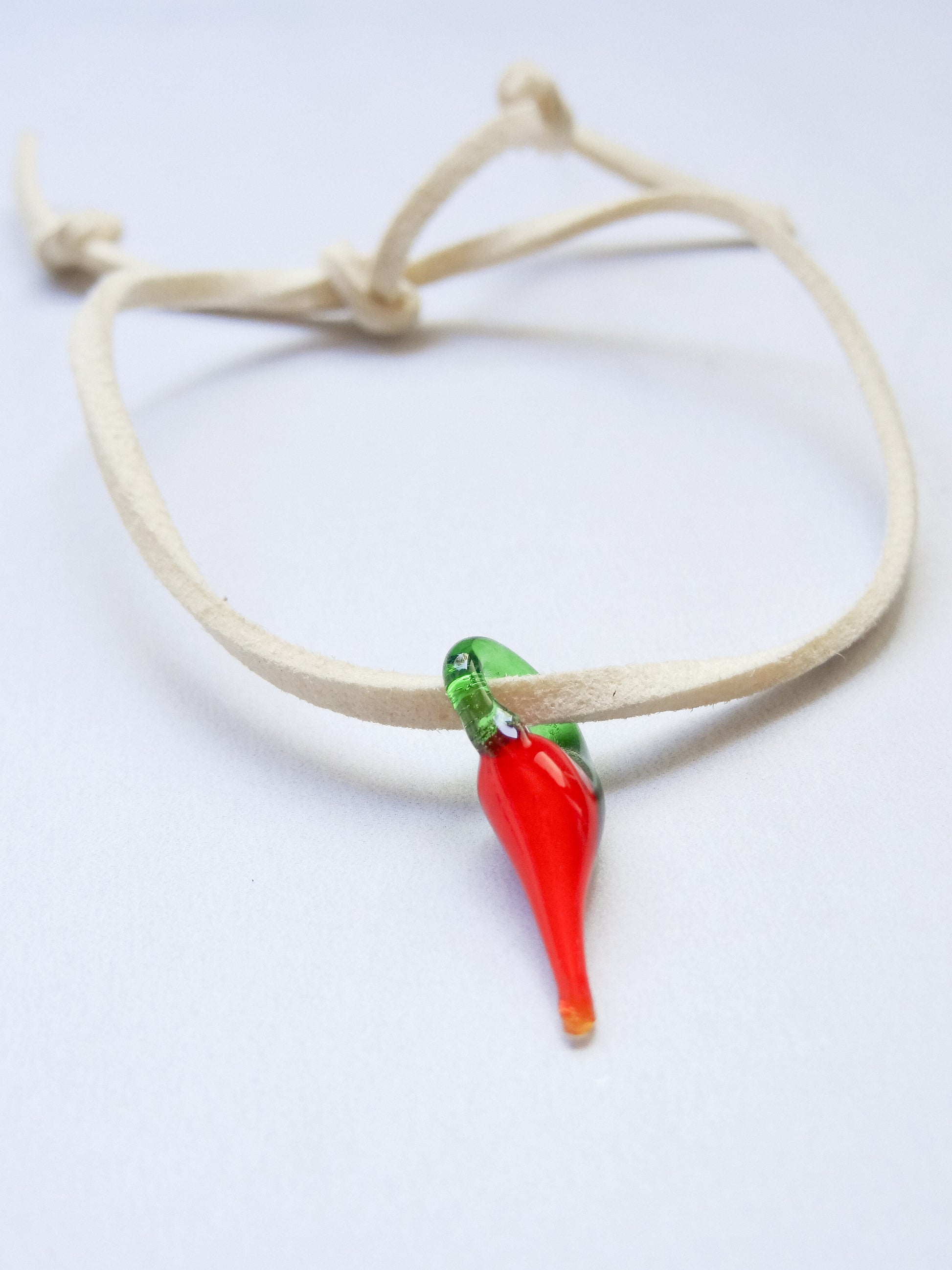 Pulsera de tira de cuerina blanca con dije de chile en vidrio, divertida y con un toque boho-chic. Ideal para aportar color y personalidad a tu look.