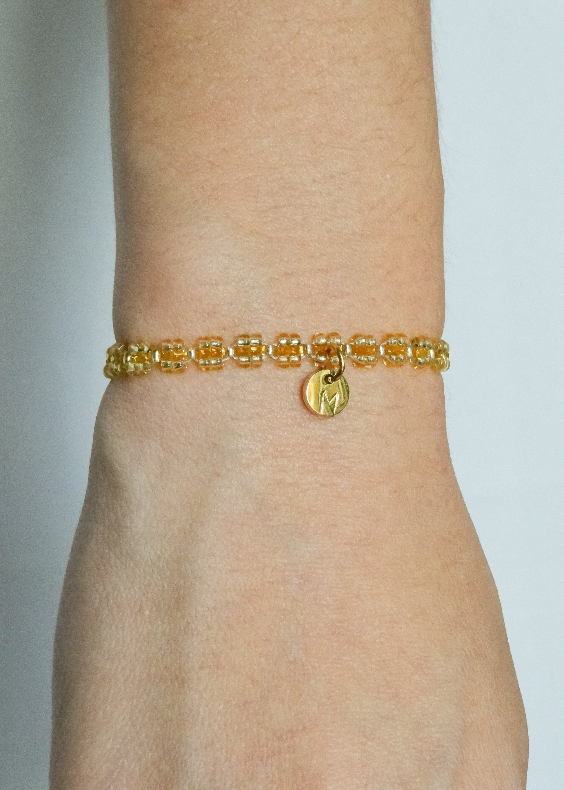 Una delicada manilla tejida con mostacillas, incluye una medalla de acero inoxidable personalizable con la inicial de tu elección.